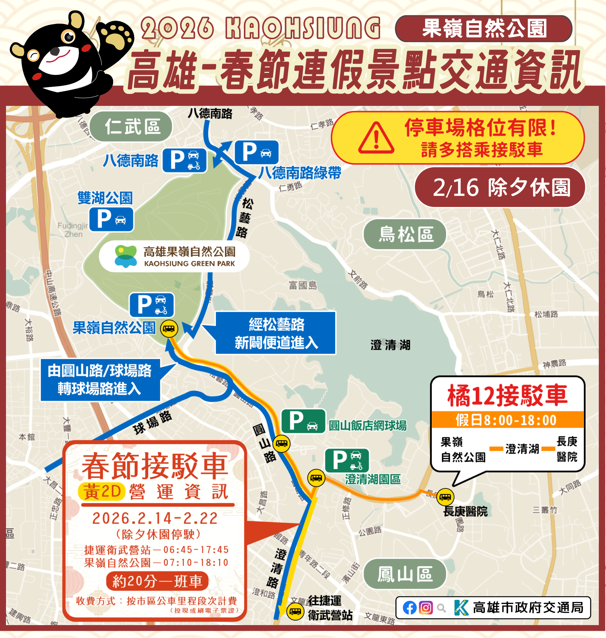 公園處表示,各場域停車空間有限且車流量大,為節省排隊等候車位的時間,建議民眾多利用大眾運輸。春節連假2/14-2/22(除夕除外),交通局規劃「黃2D」接駁公車由捷運衛武營站發車,約20分鐘一班;以及「橘12」接駁車往返於園區、澄清湖與長庚醫院。民眾若需查詢最近的公車站位或即時班次資訊,可下載「高雄iBus」App 或利用「高雄市公車動態資訊系統」網頁,即時掌握公車到站時間,讓行程規劃更具彈性。